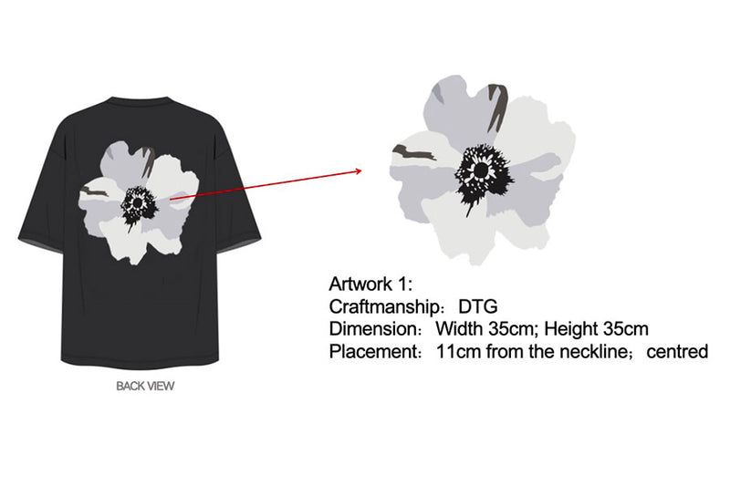Another key detail to include in your tech pack is the method you'd like for applying your artwork to the garment. This could be: DTG, screen printing, embroidery, etc.
